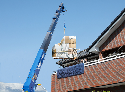 階段での搬入・搬出ができない場合は専用クレーン車輌で作業いたします。通路が狭くクレーン車輌が通れない場所での作業は特殊器具を使用して行います。
